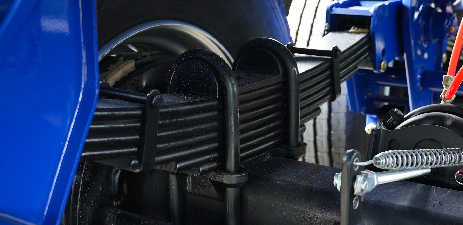Hệ thống treo của sơ mi rơ moóc tải có mui Thaco Trailers được trang bị gối thẳng kết hợp nhíp 7 lá (90 × 16 mm), giúp hấp thụ rung động, duy trì độ ổn định khi di chuyển trên mặt đường không bằng phẳng hoặc khi chở hàng nặng trong thời gian dài.